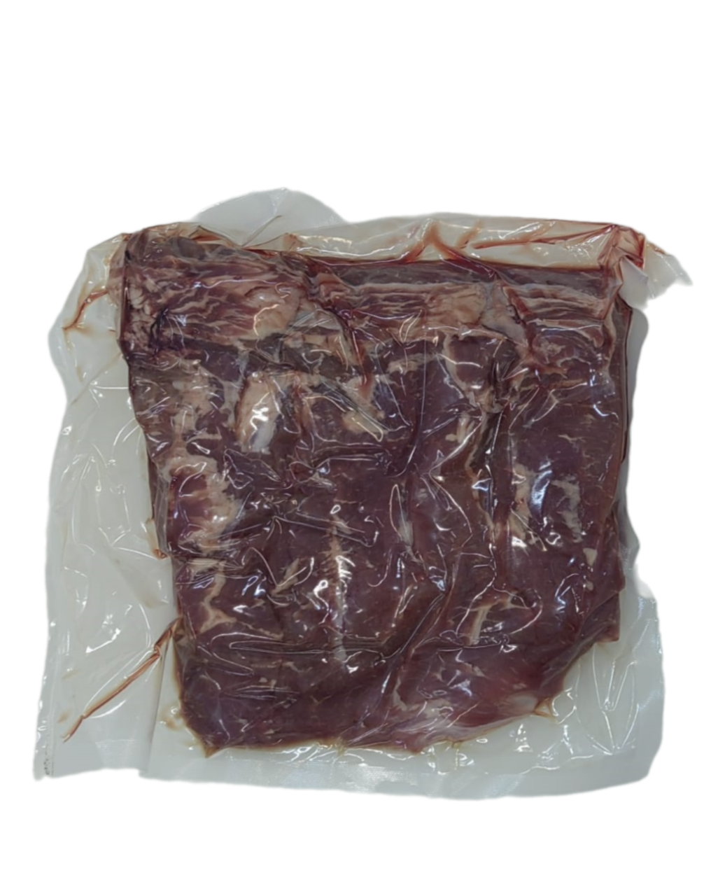 Стриплойн, или тонкий край - это бескостная мякоть поясничной части, представляет собой особый вид мяса, который поражает своей нежностью и вкусовыми качествами. Вырезается из тонкого края, включающего единственную мышцу. Его отличительной чертой является тонкий слой жира, обрамляющий мясо с одной стороны. Стриплойн имеет плотную текстуру, глубокий вкус и насыщенный аромат. Говядина зернового откорма отличается высоким содержанием внутримышечного жира, поэтому стейк получается сочным. Лучше всего он раскрывает свои качества при прожарке Medium rare (также допускается Rare. Подходит для приготовления на сковороде и гриле. Подавайте Стриплойн с клюквенным соусом или гуакамоле.