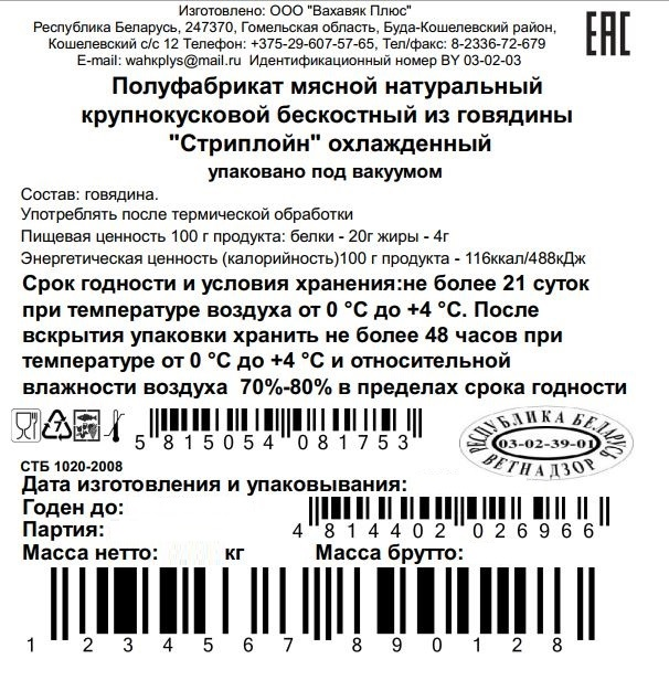 Стриплойн говяжий Вахавяк Плюс бескостный охлажденный, ~1.8кг