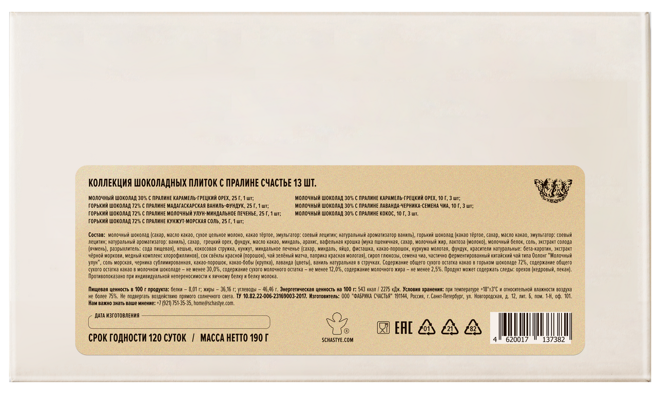 Шоколадная плитка с пралине - это интересная альтернатива фирменному кубику пралине Счастье. Другая форма - другой вкус, это то, что можно взять с собой, подарить или съесть вот прямо сейчас. Мы приготовили наши шоколадные плитки с начинками пралине в двух форматах и объединили их в набор, чтобы и для большого, и для маленького повода нашлось своё Счастье.
