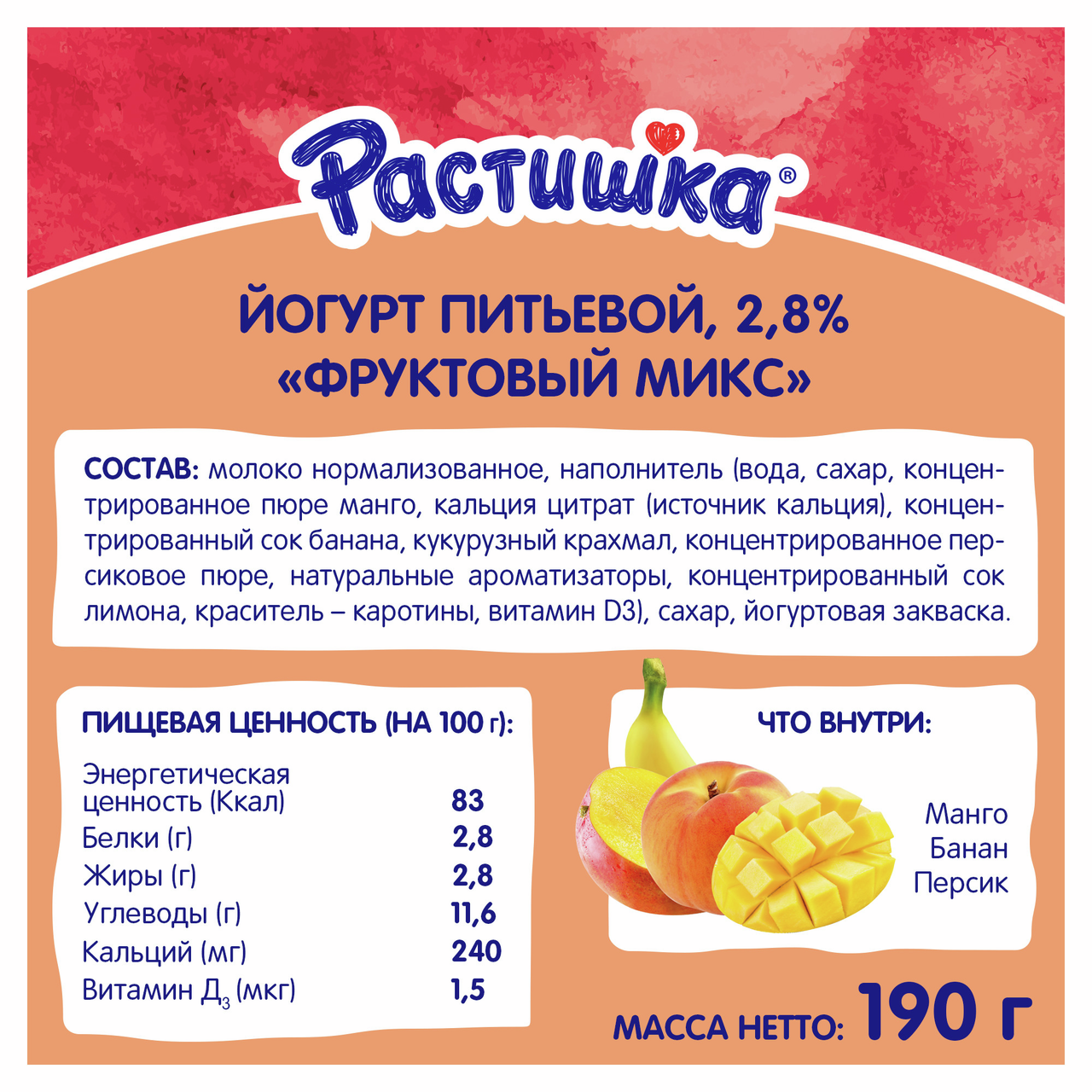 Йогурт питьевой детский Растишка Фруктовый микс 2.8% с 3 лет, 190г