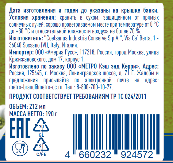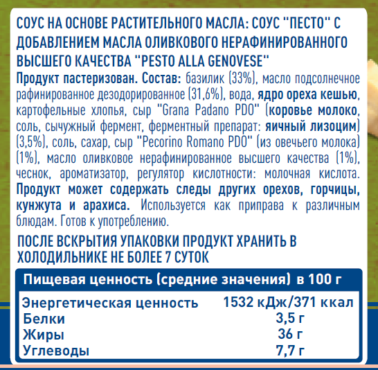 Базилик (33 %), масло подсолнечное рафинированное дезодорированное (31,6 %), вода, ядро ореха кешью, картофельные хлопья, сыр "Grana Padano PDO" (коровье молоко, соль, сычужный фермент, ферментный препарат: яичный лизоцим) (3,5 %), соль, сахар, сыр "Pecorino Romano PDO" (из овечьего молока) (1 %), масло оливковое нерафинированное высшего качества (1 %), чеснок, ароматизатор, регулятор кислотности: молочная кислота.