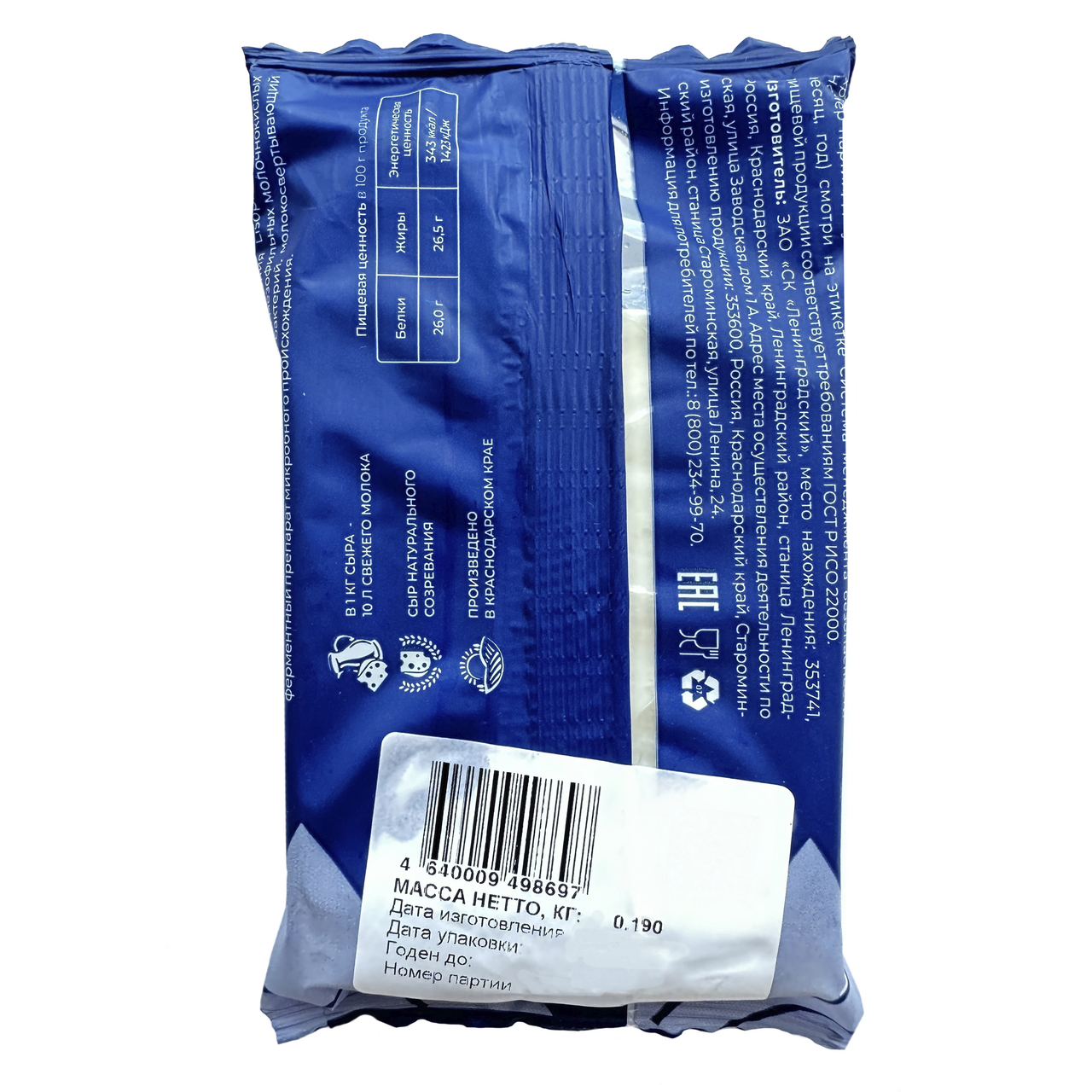 Молоко нормализованное пастеризованное, соль пищевая, ферментный препарат животного происхождения Lisoproq (лизоцима гидрохлорид, вода), бактериальная закваска мезофильных молочнокислых микроорганизмов и пропионовокислых бактерий, молокосвертывающий ферментный препарат микробного происхождения.