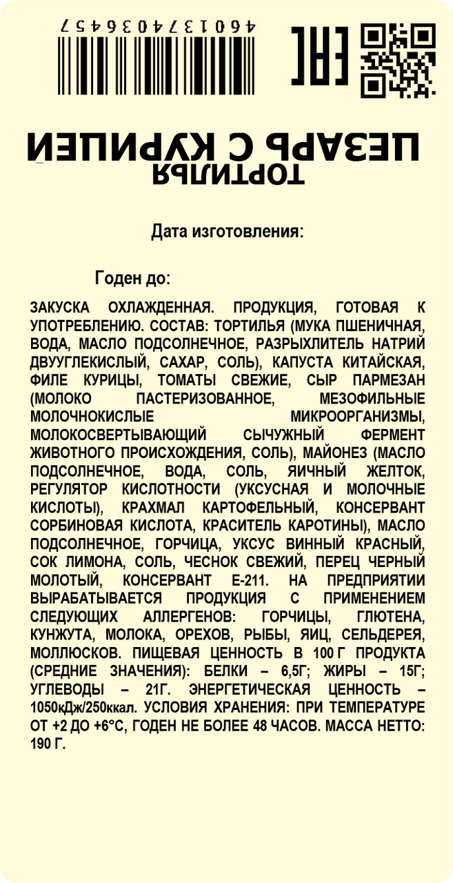 Мука пшеничная высшего сорта, вода питьевая, жир растительный, натрий двууглекислый, сахар-песок, соль поваренная пищевая, капуста китайская, филе куриное, томаты свежие, сыр Пармезан, майонез, масло растительное подсолнечное, горчица, уксус винный, сок лимона, соль поваренная пищевая, чеснок свежий, перец чёрный молотый, консервант Е-211.