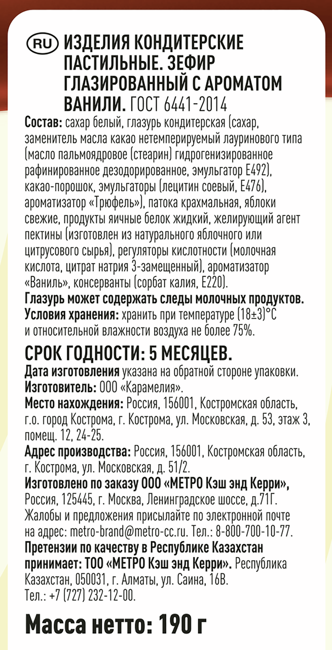 Сахар белый, глазурь кондитерская (сахар, заменитель масла какао нетемперируемый лауринового типа (масло пальмоядровое (стеарин) гидрогенизированное рафинированное дезодорированное, эмульгатор E492), какао-порошок, эмульгаторы (лецитин соевый, E476), ароматизатор Трюфель), патока крахмальная, яблоки свежие, продукты яичные белок жидкий, желирующий агент пектины (изготовлен из натурального яблочного или цитрусового сырья), регуляторы кислотности (молочная кислота, цитрат натрия 3-замещенный), ароматизатор Ваниль, консерванты (сорбат калия, E220).