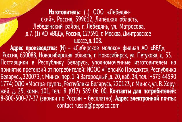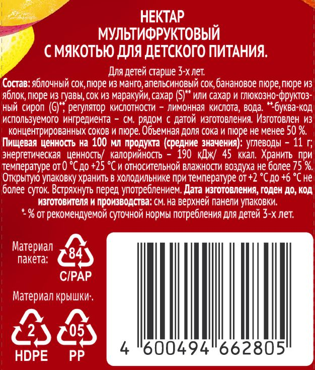 Яблочный сок, пюре из манго, апельсиновый сок, банановое пюре, пюре из яблок, пюре из гуавы, сок из маракуйи, сахар (S)** или сахар и глюкозно-фруктозный сироп (G)**, регулятор кислотности – лимонная кислота, вода. **-буква-код используемого ингредиента – см. рядом с датой изготовления.
