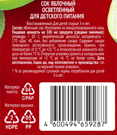 Сок для здорового питания для детей и взрослых, производится по особой рецептуре. При комнатной температуре в аромате сока чувствуются нежные цветочные ноты. Сбалансированный, обволакивающий вкус спелого сочного яблока мягкий, умеренно-сладкий, округлый с долгим медово- карамельным послевкусием.
