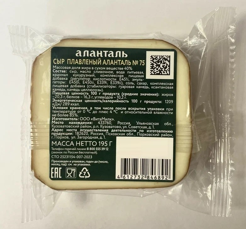 Сыр плавленый Аланталь №75 кусок 40%, 195г