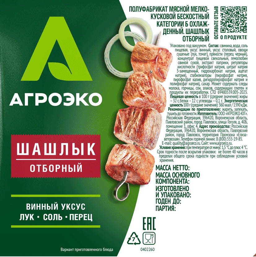 Шашлык из свинины АгроЭко Отборный охлажденный, ~1.9кг