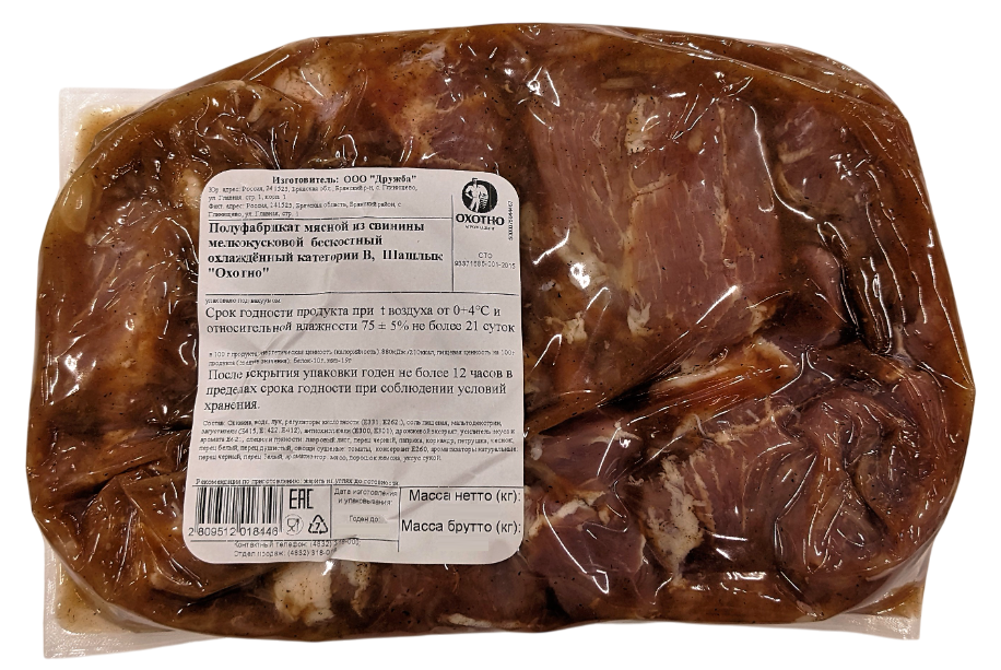 Это сочный свиной окорок, порезанный на кубики одинакового размера и замаринованный в классической смеси пряных специй (соль, перец, лук и горчица). Оптимальное соотношение постного мяса и жировых прослоек гарантирует отменный вкус и особую нежность готового шашлыка. Кусочки аккуратно нанизываются на шампур и равномерно прожариваются на открытом огне.