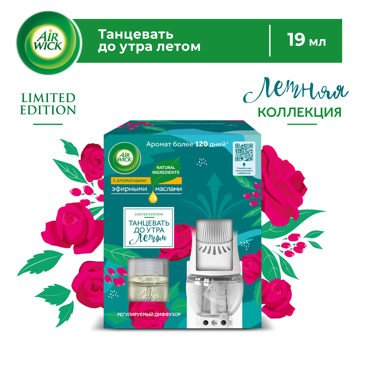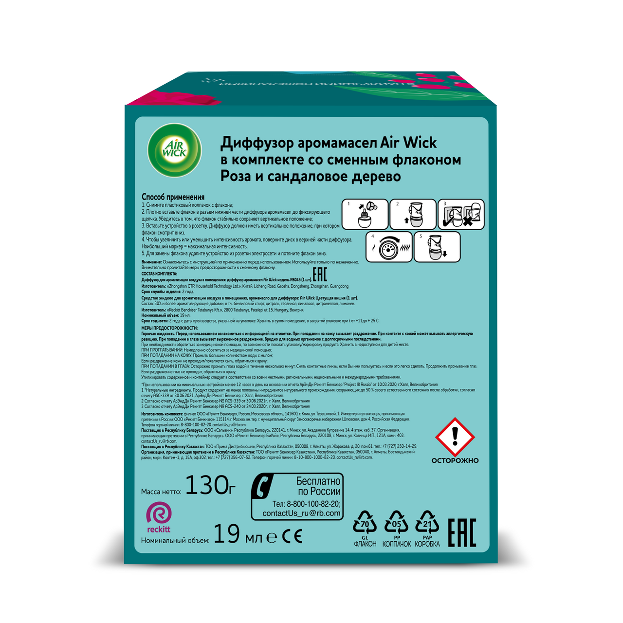 Диффузор аромамасел в комплекте со сменным флаконом: Air Wick Дикая роза и сандаловое дерево.Аромамасло для диффузора содержит натуральные эфирные масла, 68,7%.Легко использовать: вставьте сменный блок для диффузора в автоматический диффузор, выберите комфортную интенсивность аромата регулятором и вставьте в розетку. Одного флакона при непрерывном использовании и минимальном нагреве хватает в среднем на 1,5 месяца плюс-минус. Если выключать диффузор на ночь, то один флакон масла обеспечит в вашем доме до 100 дней приятного аромата, как и указано на упаковке. В отличии от автоматического аэрозольного диспенсера, масляный диффузор беззвучный (нет вероятности случайно напугать домашних животных или детей).