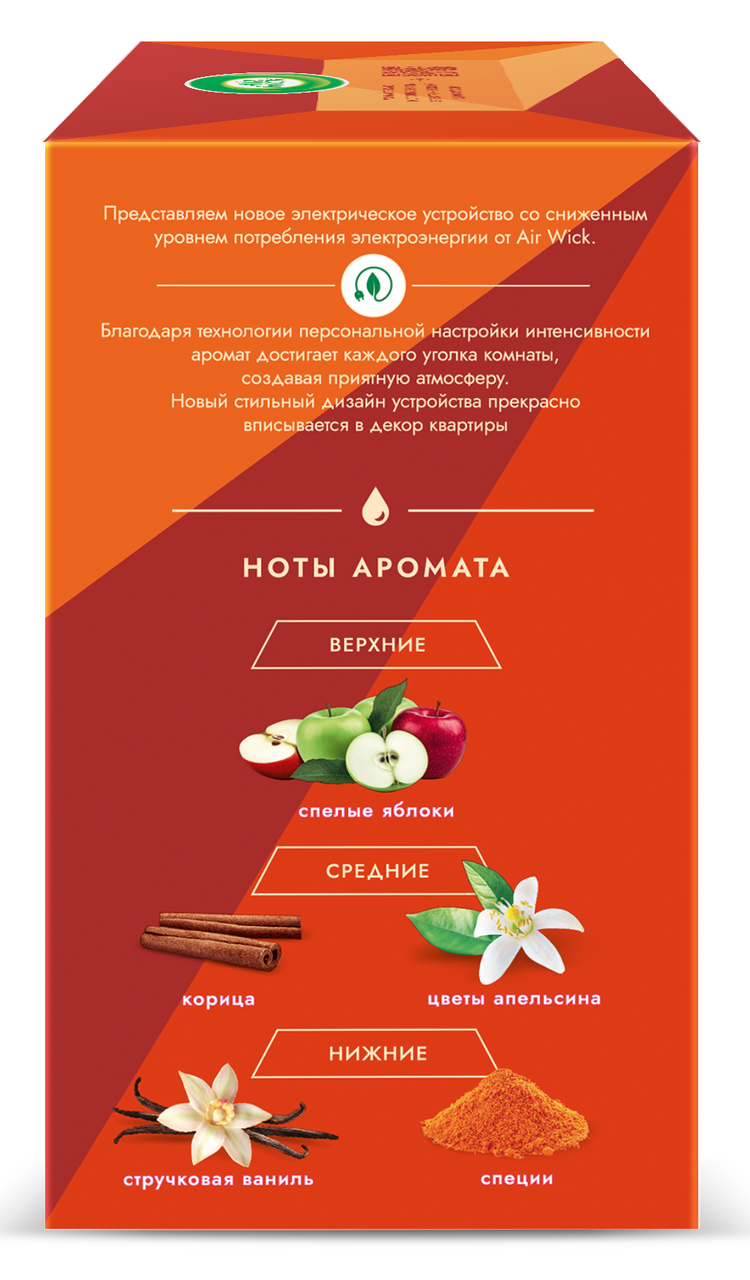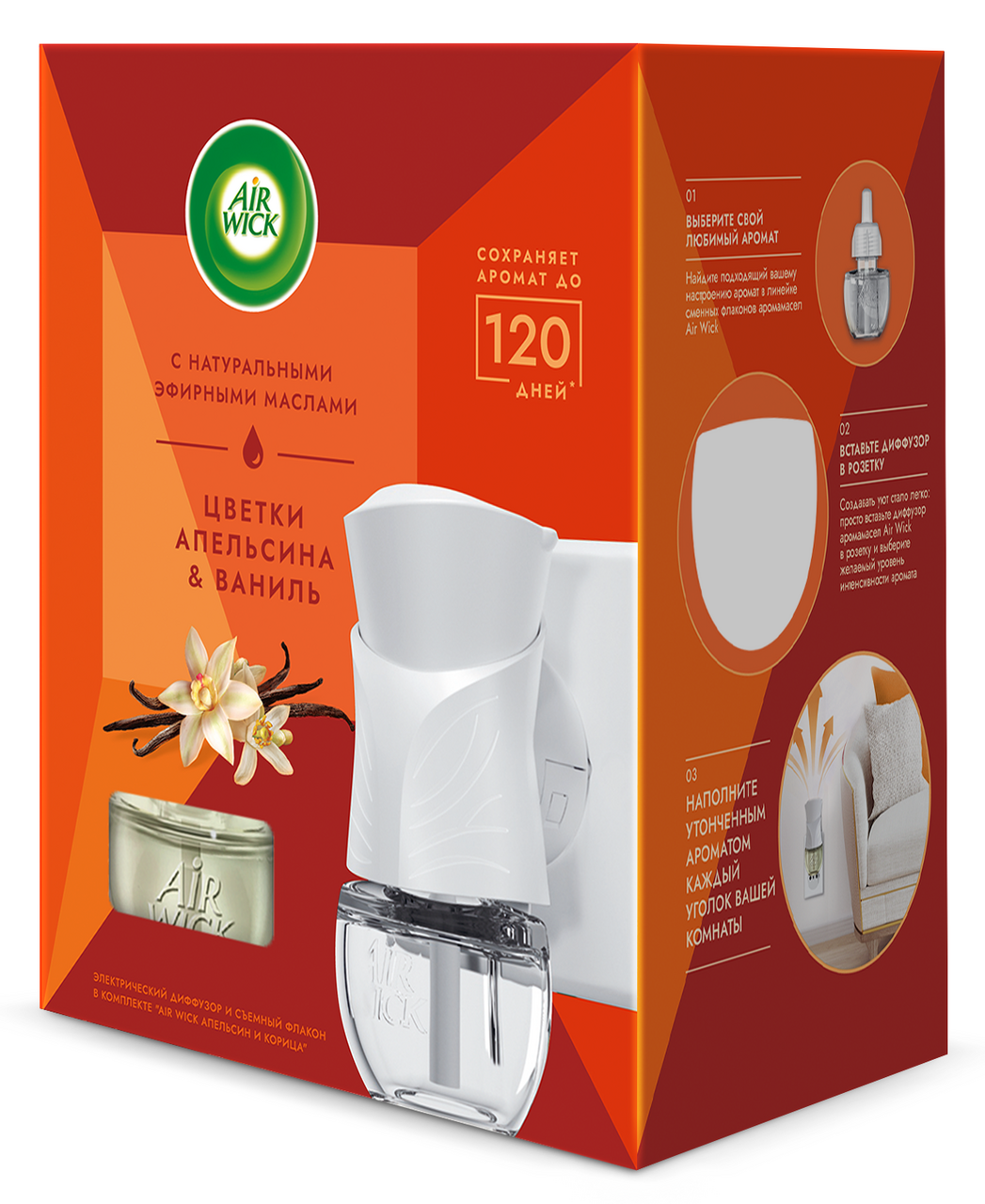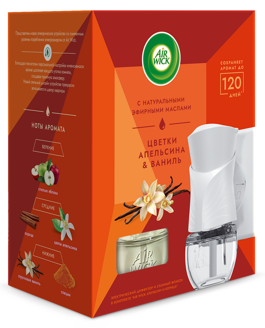 Изысканный дуэт нежности и тепла. Утончённые цветочные ноты апельсина встречаются с бархатной мягкостью мадагаскарской ванили, создавая чувственный, глубокий аромат. Диффузор аромамасел Airwick наполнит Ваш дом ароматом, вдохновленным самой природой, который длится день за днем. Ощутите теплый аромат апельсина и корицы у себя дома вместе с Air Wick.