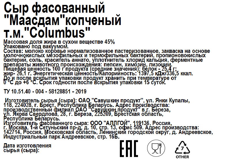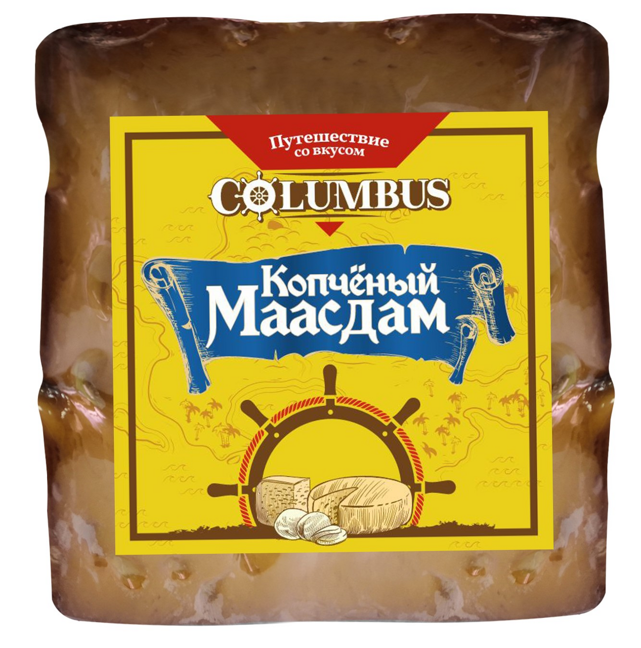 Сыр Columbus Маасдам копченый 45%, ~1кг БЗМЖ. Сыр Columbus Маасдам копченый 45%, 1кг БЗМЖ – прекрасный выбор для любителей качественного и вкусного сыра. Сыр изготовлен из молока коров по традиционному рецепту и копчен в натуральной соли. Приятная корочка и вкусная плювиальная структура делают его одним из самых любимых сыров в мире.