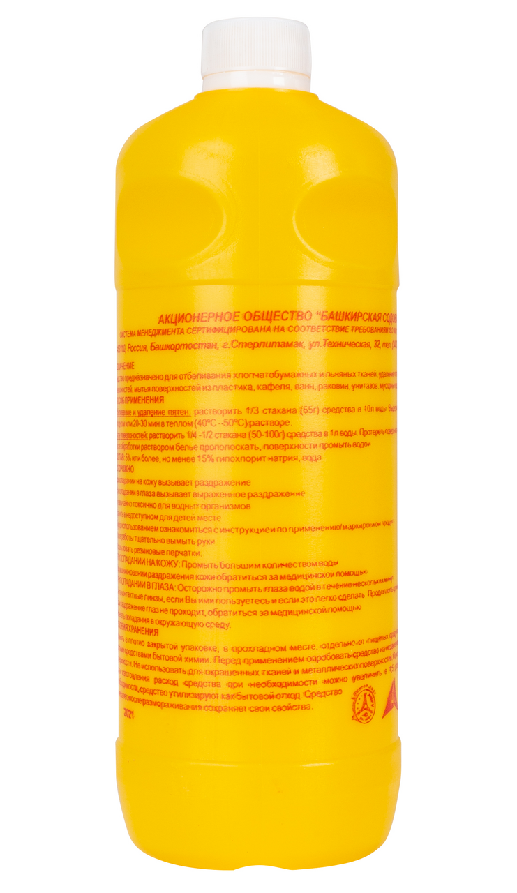 Средство жидкое отбеливающее. Для удаления и отбеливания пятен с белых изделий и хлопчатобумажных и льняных тканей, для мытья эмалированных, фарфоровых, фаянсовых поверхностей, облицовочной плитки, пластика, для чистки унитаза, мусорных ведер. Способ применения: отбеливание и удаление пятен – 60г (5 ст. ложек на 10л воды), выдержать в растворе 20 минут при температуре (40-50С), при комнатной температуре 60 минут. Мытье поверхностей и так далее: 100 г (1/2 стакана на 1л воды), протереть поверхность раствором. Чистка унитазов и мусорных ведер – 150г (3/4 стакана на 1 л воды), залить раствором при комнатной температуре и выдержать 40-60 минут. Меры предосторожности: беречь от нагрева! При попадании средства в глаза и на кожу немедленно промыть большим количеством воды. При работе использовать резиновые перчатки.Используется для: отбеливания и удаления пятен с хлопчатобумажных и льняных тканей, дезинфекции посуды, кафеля, ванн, раковин, унитазов и других поверхностей, растворения и удаления загрязнений.