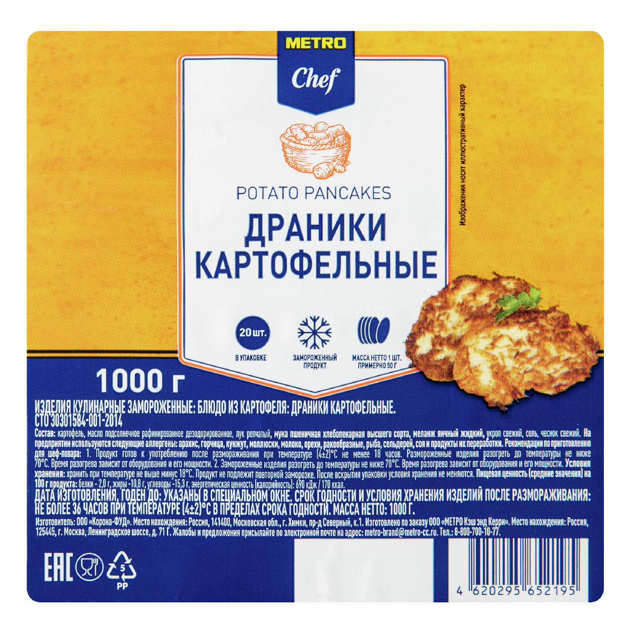 Драники картофельные METRO Chef изготовлены из натуральных ингредиентов и не содержат усилителей вкуса, красителей и консервантов. Размороженные или замороженные драники нужно разогреть до температуры не ниже 70С на сковороде или в духовке. Время разогрева зависит от оборудования и его мощности. можно подавать со сметаной, соусами, дополнить зеленью.