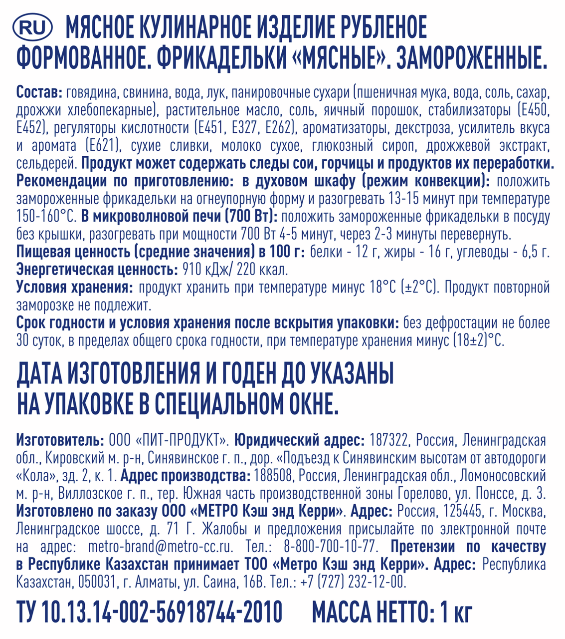 Говядина, свинина, вода, лук, панировочные сухари (пшеничная мука, вода, соль, дрожжи хлебопекарные), растительное масло, соль, яичный порошок, стабилизаторы (Е450, Е452), регуляторы кислотности (Е451, Е327, Е262), ароматизаторы, декстроза, усилитель вкуса и аромата (Е621), сухие сливки, молоко сухое, глюкозный сироп, дрожжевой экстракт, сельдерей.
