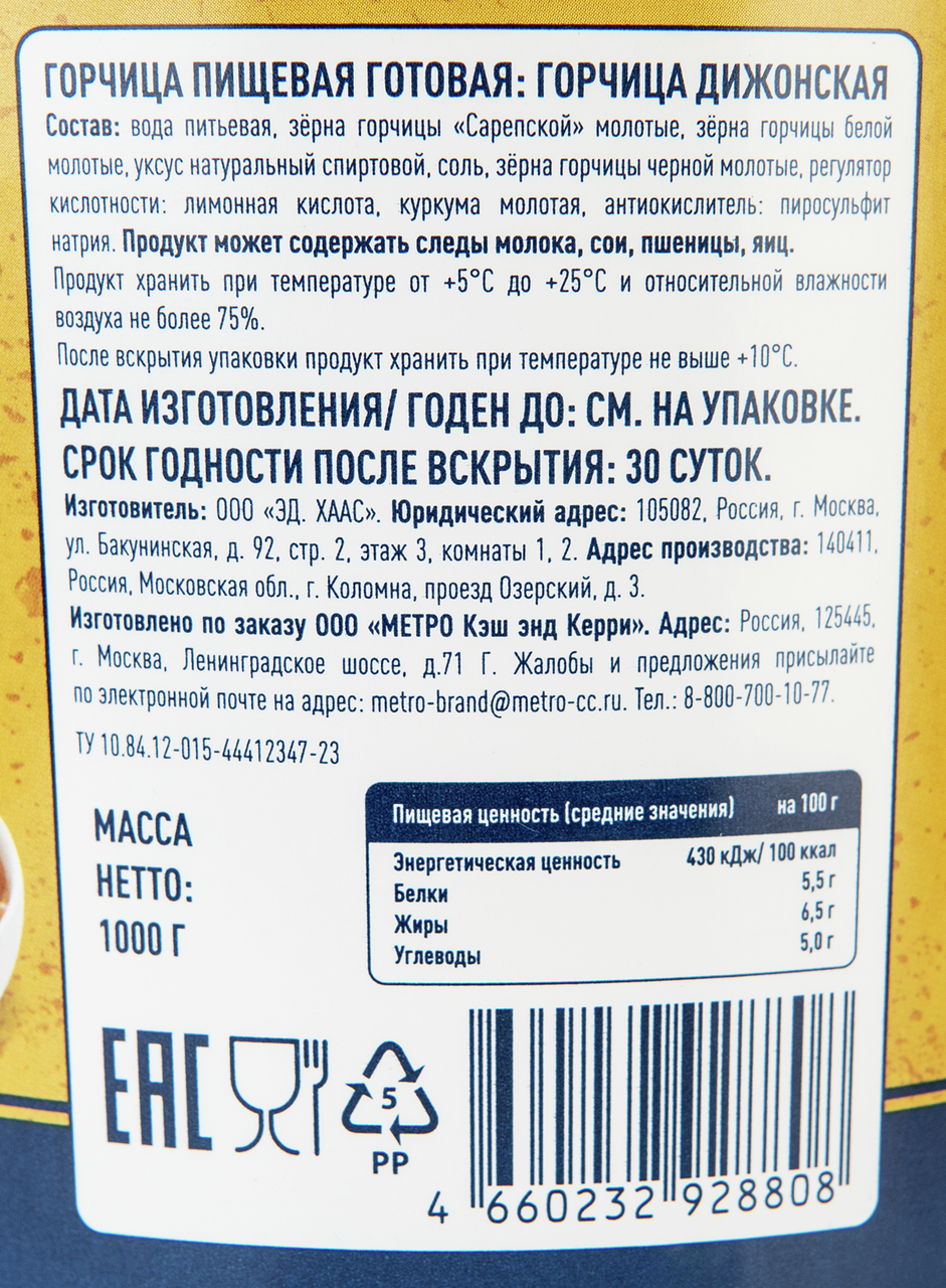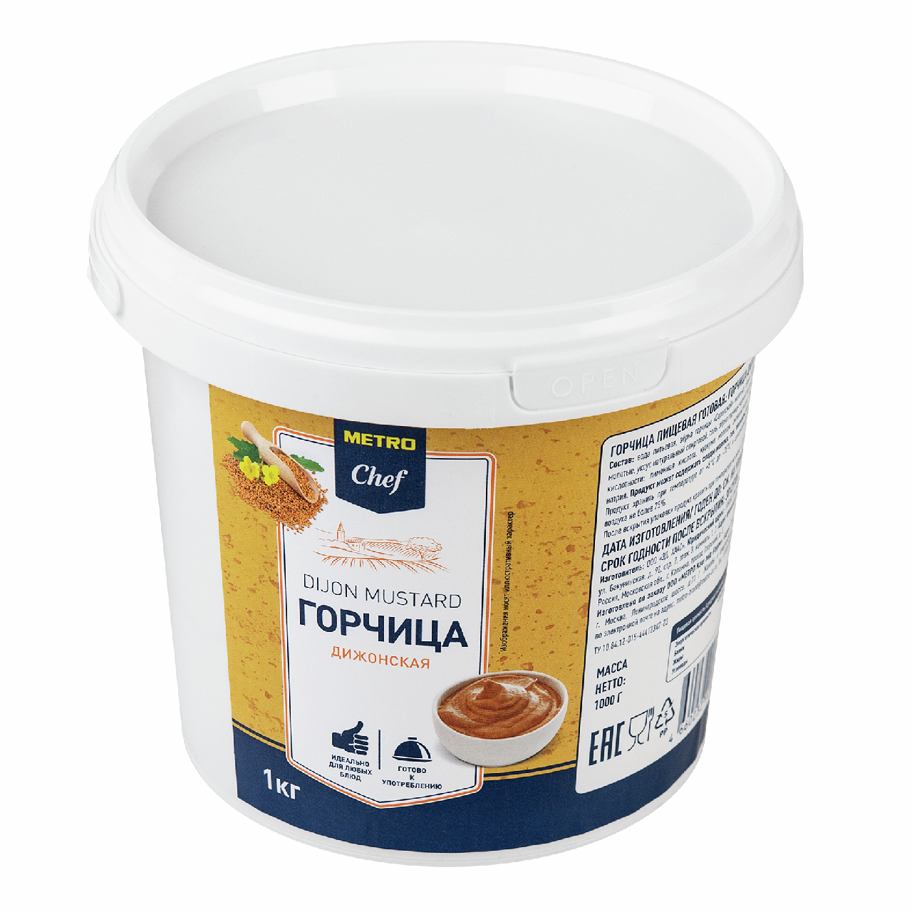 Обладает традиционным вкусом с легкой с кисло-соленой ноткой. Она станет прекрасным дополнением для блюд из курицы и рыбы, стейков, приготовленных на гриле, колбасных изделий, а также заправкой для салатов, приправы для гамбургеров и хот-догов. Горчица Metro Chef изготовлена исключительно из натуральных зерен, без применения горчичного порошка. У продукта мягкий вкус с легкой кислинкой, насыщенная острота и жидковатая, но не водянистая консистенция. Такая горчица подойдет для приготовления соусов, маринадов, заправки для салатов, намазки для бутербродов. Она гармонично сочетается с рыбой, зеленью, любым мясом и цитрусовыми.