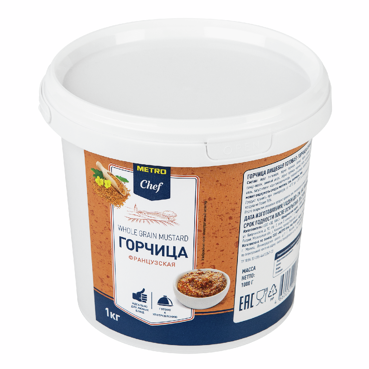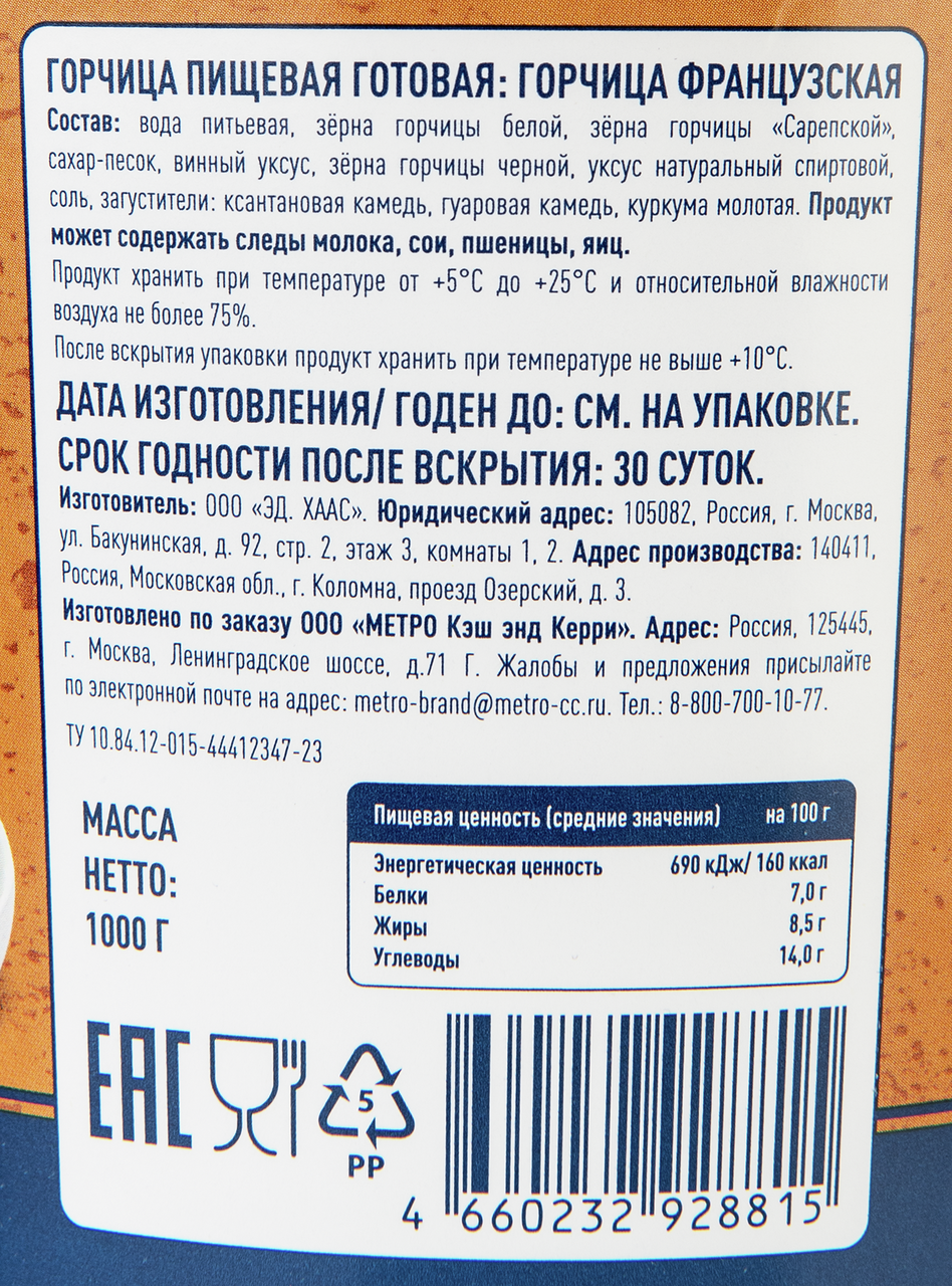 Вода питьевая, зёрна горчицы белой, зёрна горчицы "Сарептской", сахар-песок, винный уксус, зёрна горчицы черной, уксус натуральный спиртовой, соль, загустители: ксантановая камедь, гуаровая камедь, куркума молотая.