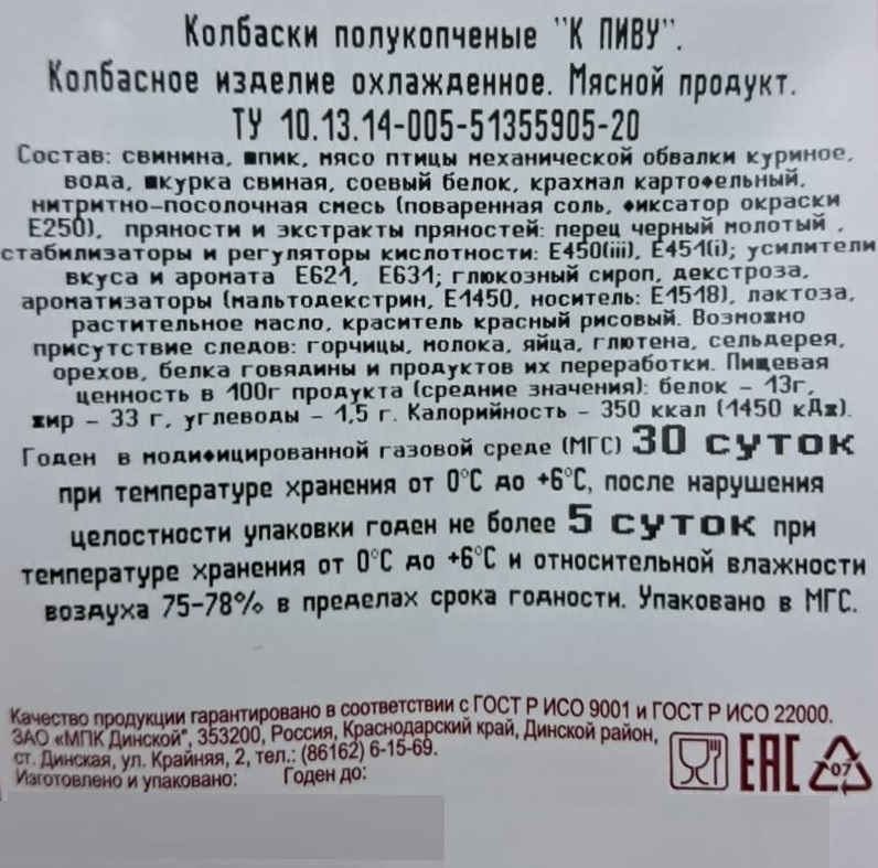 Свинина, мясо птицы механической обвалки куриное, шпик, соевый белок, вода, крахмал картофельный, нитритно-посолочная смесь (поваренная соль, фиксатор окраски – нитрит натрия), пищевые добавки (специи (чеснок, мускатный орех), экстракты натуральных специй: перец чили, паприка, декстроза, загустители – Е407, конжаковая камедь, желирующий агент-хлорид калия, мальтодекстрин, стабилизаторы – пирофосфаты, регуляторы кислотности – трифосфаты, натуральный краситель – красный рисовый).