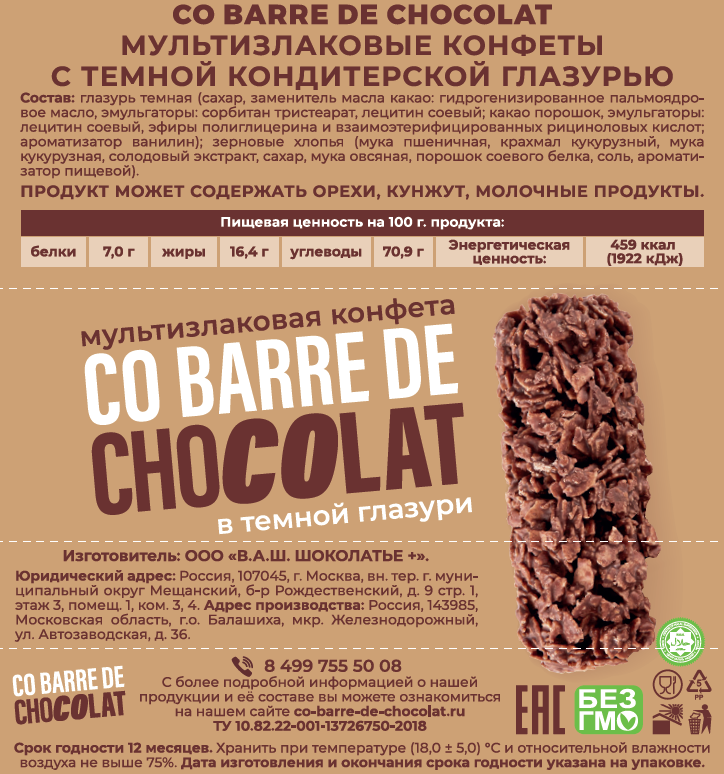 В.А.Ш. Шоколатье+ - инновационная кондитерская фабрика, объединяющая многолетний опыт кондитеров и современные технологии по производству мультизлаковых конфет. Компания является лидером в категории мультизлаковых конфет с 2017гсобственное производство глазури и хлопьев позволяет контролировать качество выпускаемого продукта. Основной состав конфет - это злаковая крупа из трех злаков: пшеницы, кукурузы и овсянки.Конфеты знают и покупают уже более чем в 25 странах. Мультизлаковые конфеты Cobarde el Chocolate с глазурью представляют собой небольшие батончики, состоящие из нескольких видов зерен: пшеницы, кукурузы иовса. Каждая гранула покрыта сладкой глазурью. Конфеты Cobarde el Chocolate станут дополнением кгорячим напиткам. Баланс между вкусом и приоритетами здорового питания! Это аппетитные, сытные, лакомые, экологически чистые конфеты с полезными злаками ставшие популярными среди сторонников здорового образа жизни. Благодаря разнообразию ингредиентов, эти конфеты не только радуют вкусовые рецепторы, но и обогащают организм полезными веществами. В состав входят мультизлаковые смеси, которые включают в себя отборный изюм, кукурузу, овес, пшеницу и ��ругие злаки. Это делает конфеты источником клетчатки, витаминов и минералов. Мультизлаковые конфеты Co barre de Chocolat идеально подойдут для праздничного стола, десерта на работе или дома или просто как приятный подарок друзьям и близким. Они украсят любое чаепитие и станут прекрасным угощением для гостей. Отлично подойдут в качестве подарка или простого угощения.