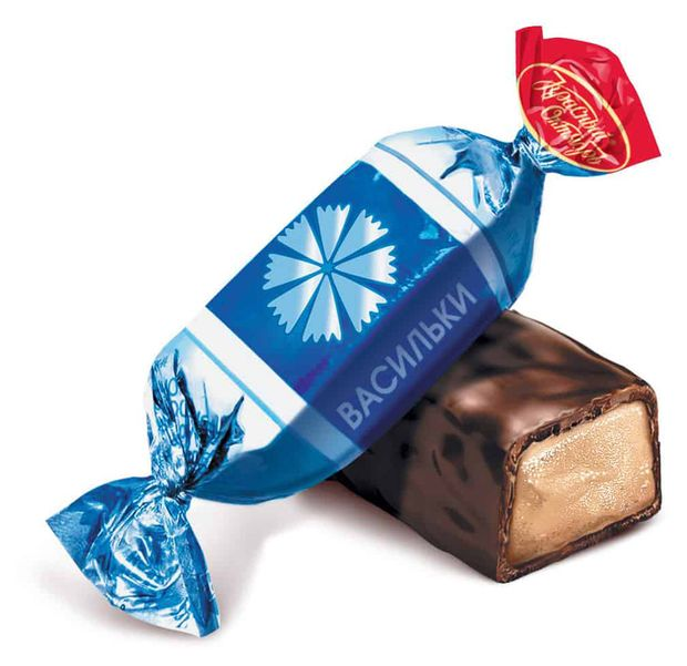 Конфеты Васильки в шоколадной глазури: воздушная тающая помадка со вкусом крем-брюле, обогащенная тертыми орешками кешью и коньяком. Мягкий бархатистый вкус с особой сладостью орехов кешью и легкие ромовые нотки, которые оттеняет вкус шоколада и яркая, знакомая с детства синева блестящих фантиков – вот такие у фабрики Рот Фронт Васильки.