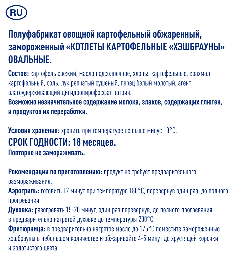 Картофельный овальный хэшбраун METRO Chef это необычная закуска, изготовленная из тёртого картофеля с добавлением сушеного лука и белого перца. Хэшбрауны легко приготовить тремя разными способами. Духовка: разогревать в предварительно нагретой духовке до температуры 220С до полного прогревания в течение 15-20 минут, перевернув один раз. Фритюрница: в предварительно нагретое до 175С масло поместите замороженные хэшбрауны в небольшом количестве и обжаривайте 3-4 минуты до хрустящей корочки и золотистого цвета. Аэрогриль: готовить 12-16 минут при температуре 190С, перевернув один раз, до полного прогревания.