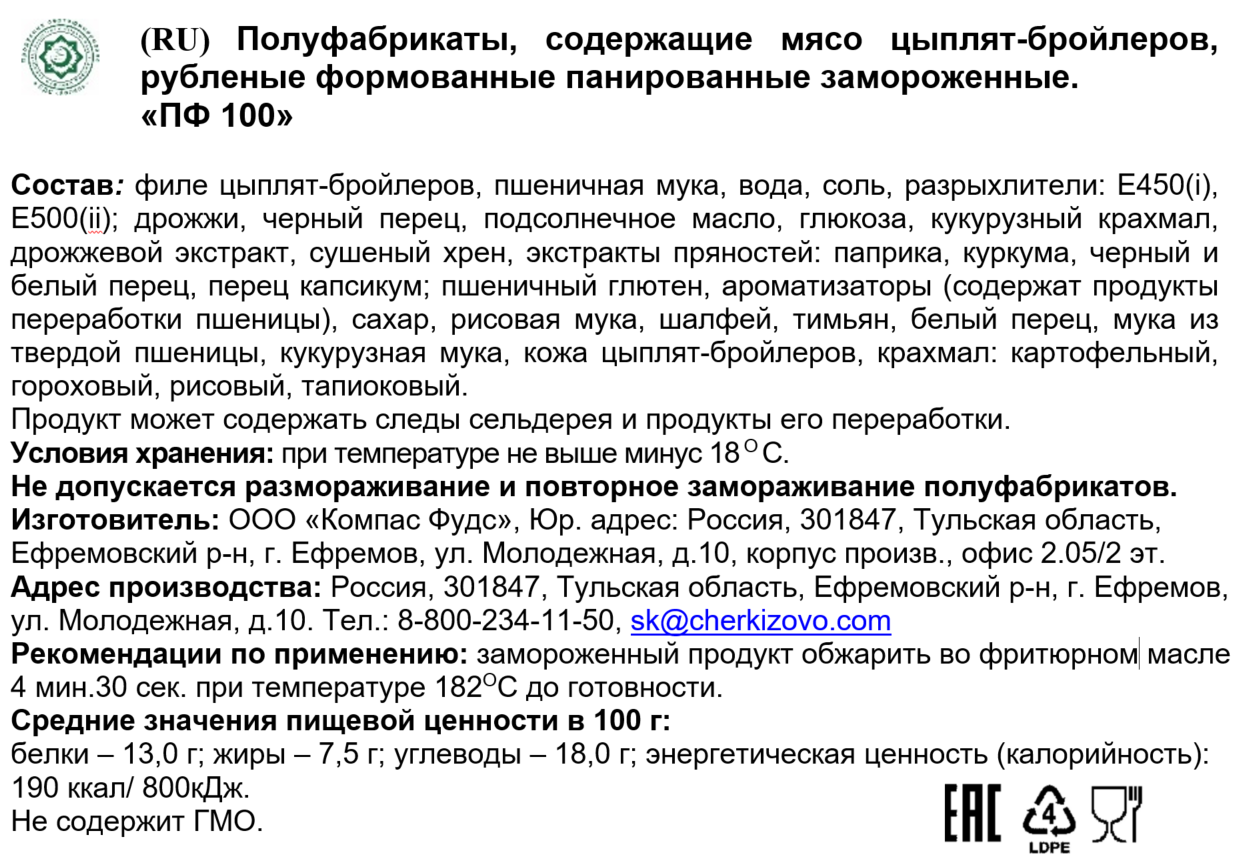 Филе цыплят-бройлеров, вода, пшеничная мука, соль, разрыхлители: Е450i, E500ii; декстроза, подсолнечное масло, пшеничный глютен, манная крупа, пшеничная клейковина, кожа цыплят-бройлеров, картофельный крахмал.