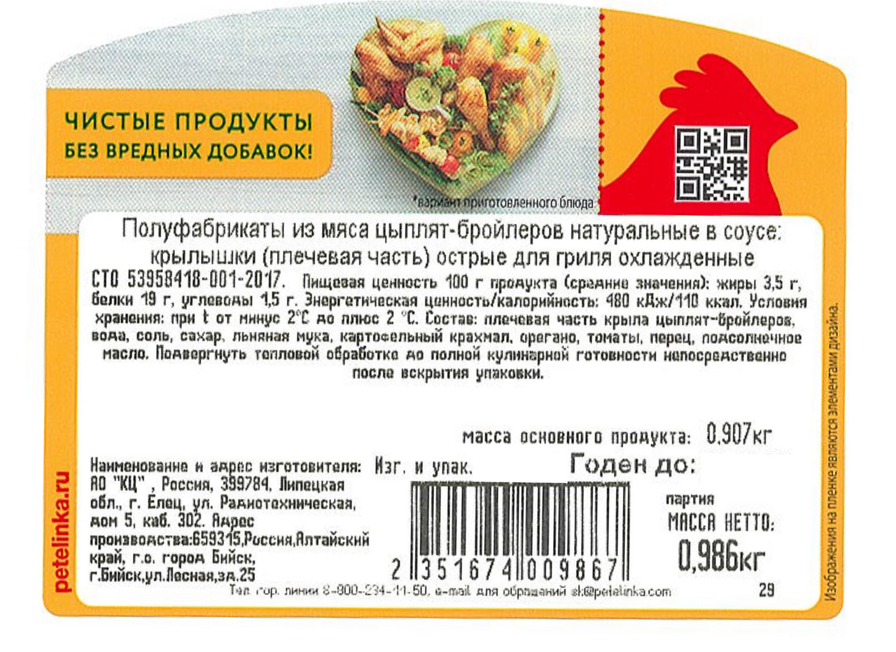 Плечевая часть крыла цыплят-бройлеров, вода, соль, сахар, льняная мука, картофельный крахмал, орегано, томаты, перец, подсолнечное масло.
