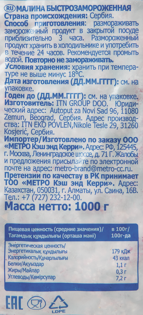 aro Малина 1кг – это целый пакет отборных ягод, который дает возможность почувствовать вкус лета в любое время года. Продукт прошел шоковую заморозку, за счет чего сохранил все свои полезные свойства. В состав входят множество витаминов, которые оказывают положительное воздействие на организм человека. Малину можно разморозить или употреблять в замороженном виде, поскольку даже в таком состоянии она остается сочной и не теряет своего насыщенного, яркого вкуса. Во время разморозки ягоды не теряют своей формы, благодаря чему их можно использовать для украшения кондитерских изделий: тортов, кексов, пирожных, а также добавлять в творог, кашу или мюсли. Малина помещена в плотную упаковку, которая долгое время сохраняет свежесть продукта. aro – это известный бренд, который принадлежит торговой сети Метро. Отличительной особенностью торговой марки являются низкие цены, благодаря чему продукция доступна даже людям с низким доходом. Широкий ассортимент включает в себя: косметику, бытовую химию, кухонную утварь и многое другое.