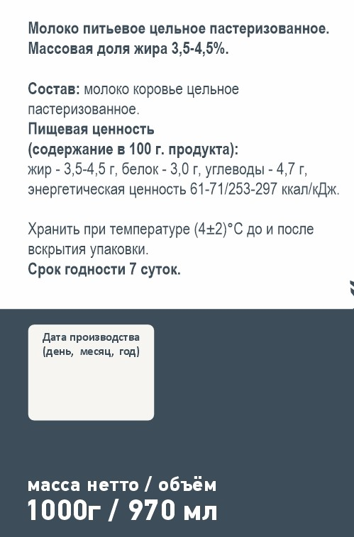 Молоко пастеризованное ГОСТ 3.5-4.5%, 1кг