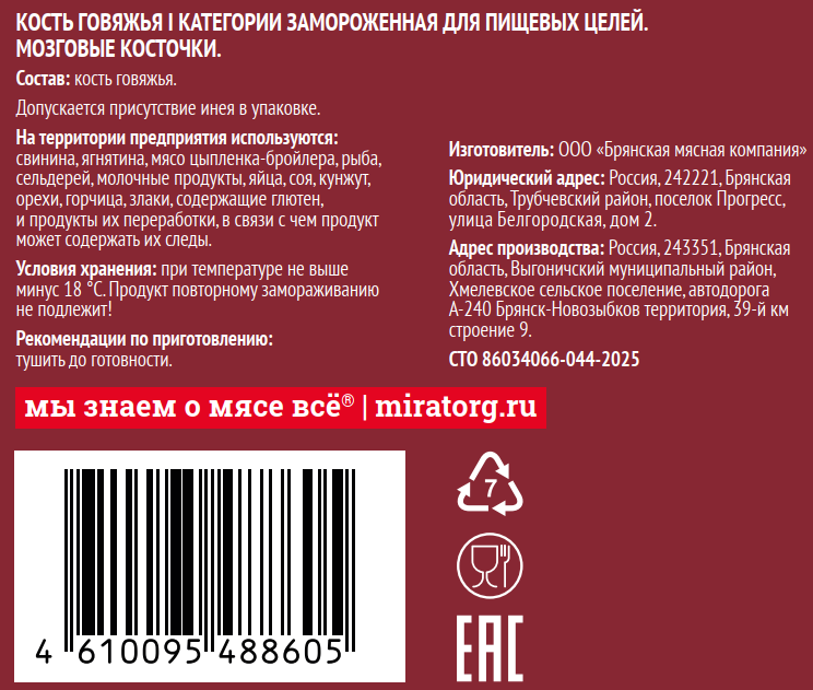 Мозговые косточки говяжьи - это трубчатые кости, полученные в результате поперечного распила говяжьей голяшки, содержащие внутри себя костный мозг. Мозговые косточки идеальны для приготовления ароматных наваристых бульонов и студня. Запечённые мозговые косточки являются настоящим деликатесом для мясных гурманов.