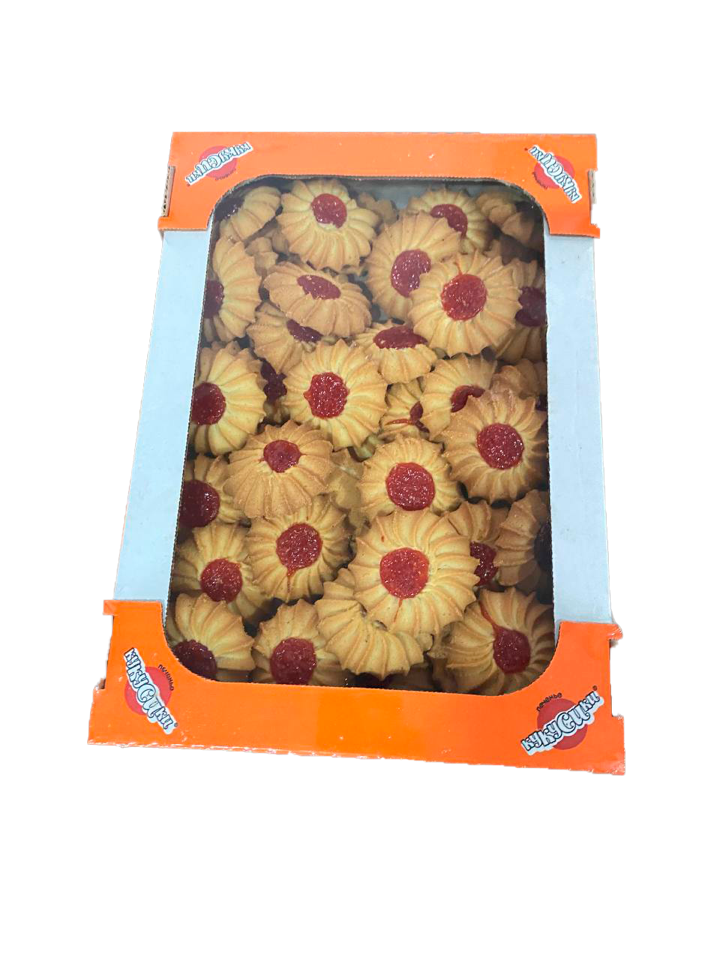 Печенье из сдобного теста в классической форме курабье с фруктовым джемом в центре. Традиционное угощение к чаю или кофе. Оно готовится из хрустящего сдобного теста с добавлением нежного фруктового джема с ароматом вишни.
