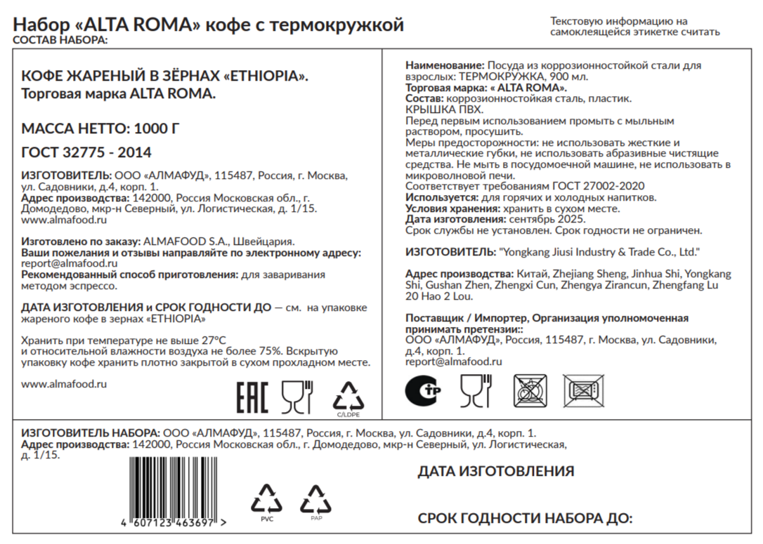 Набор подарочный Alta Roma Ethiopia кофе с термокружкой, 1кг