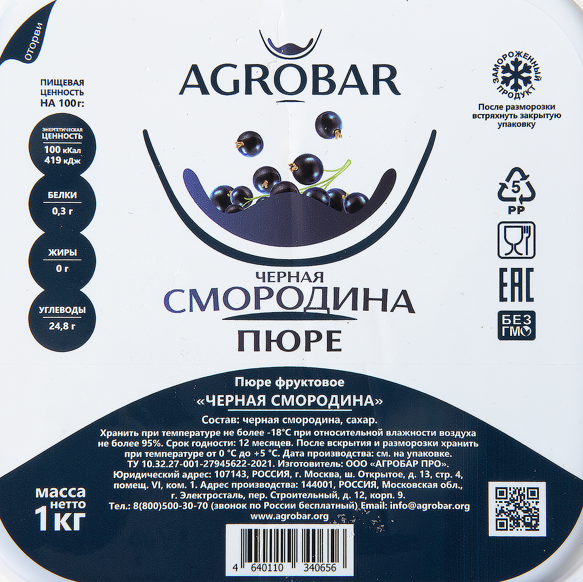 Пюре Agrobar фруктовое черная смородина замороженное, 1кг