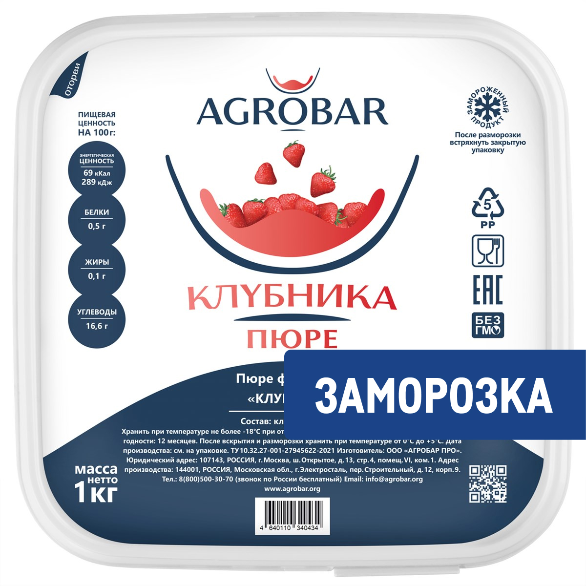 Пюре Agrobar фруктовое клубника замороженное, 1кг