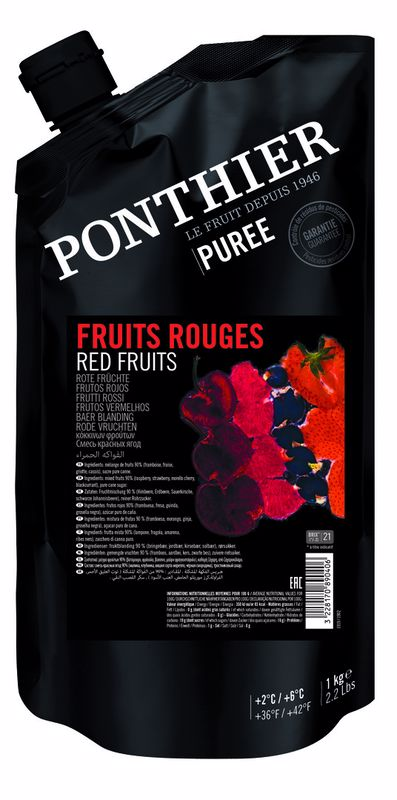 Пюре плодовое и ягодное подвергнутое термической обработке с добавлением или без добавления сахара охлажденное: Смесь красных фруктов (малина, клубника, вишня морелло, черная смородина) 90%, тросниковый сахар 10%, пищевая ценность: жиры -0, белки -1,углеводы -19 Энергетическая ценность 83 кКал, Температура хранения : 2-6C, срок годности 456 дней