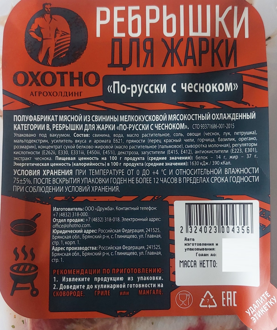 Ребрышки свиные Охотно По-русски с чесноком охлажденные, ~1кг