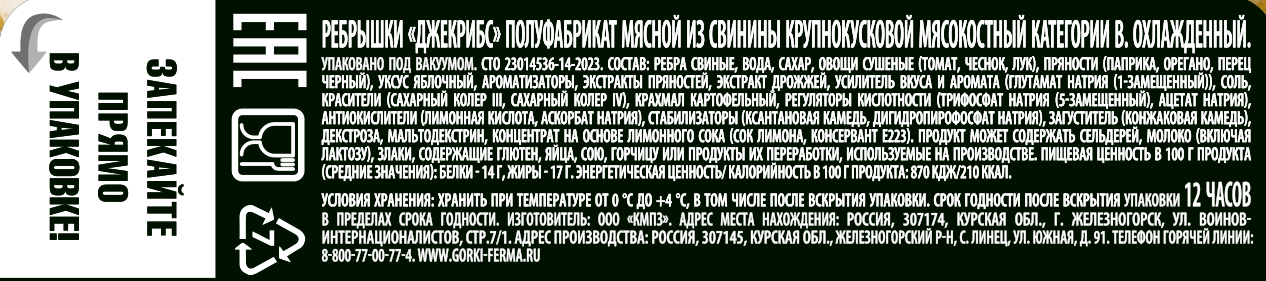 Ребрышки свиные Ближние горки Джекрибс охлажденные, ~1кг