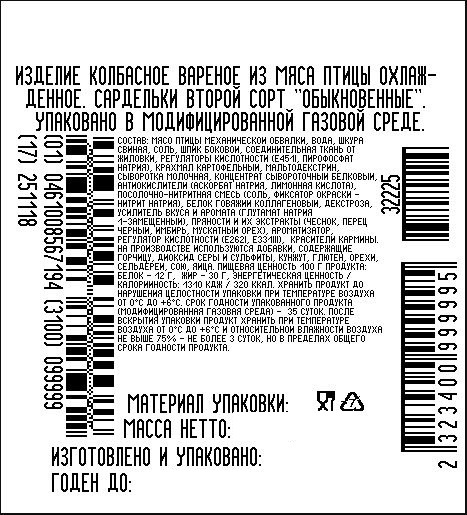 Мясо птицы механической обвалки, жир свиной, вода, соль, натуральные специи и пряности (паприка, кориандр), сахар, шкурка свиная, крупа перловая, соевый белок, нитритно-посолочная смесь (соль, фиксатор окраски: нитрит натрия), животный белок, крахмал картофельный, мальтодекстрин, декстроза, стабилизатор (ксантановая камедь, камедь рожкового дерева, Е466, Е450), загуститель (каррагинан, гуаровая камедь), клетчатка пшеничная, желирующий агент (Е508), регулятор кислотности (Е451, Е331, карбонат натрия), усилитель вкуса и аромата (Е621), ароматизаторы, горчичный порошок, краситель (кармин, красный рисовый).