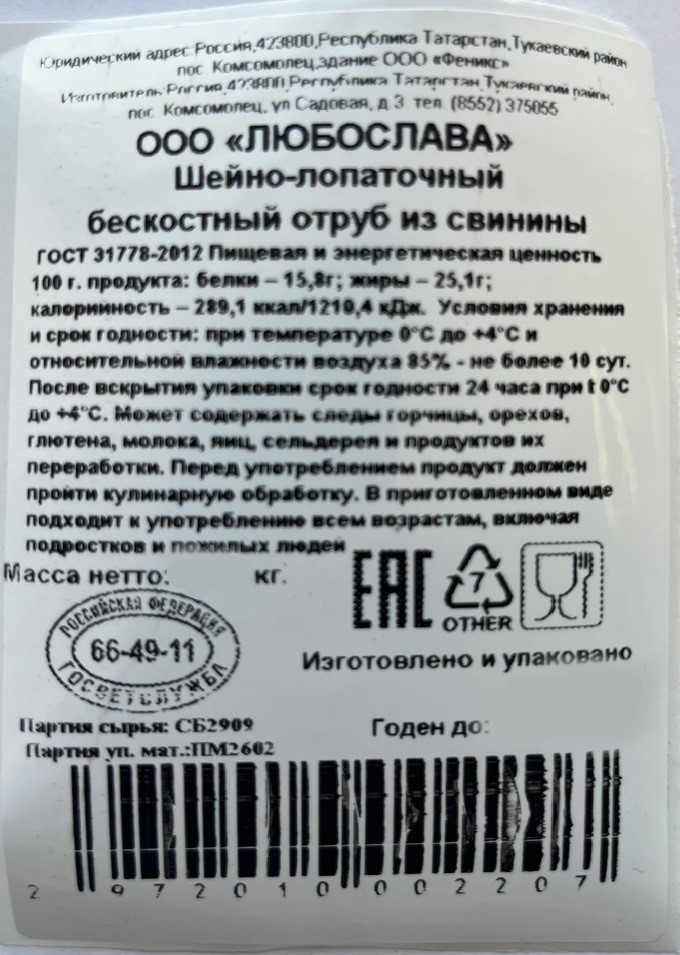 Отруб свиной шейно-лопаточный Любослава охлажденный, ~1кг