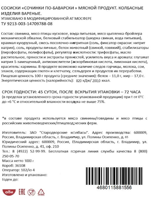 Сосиски Стародворье сочинки по-баварски вареные, ~1кг
