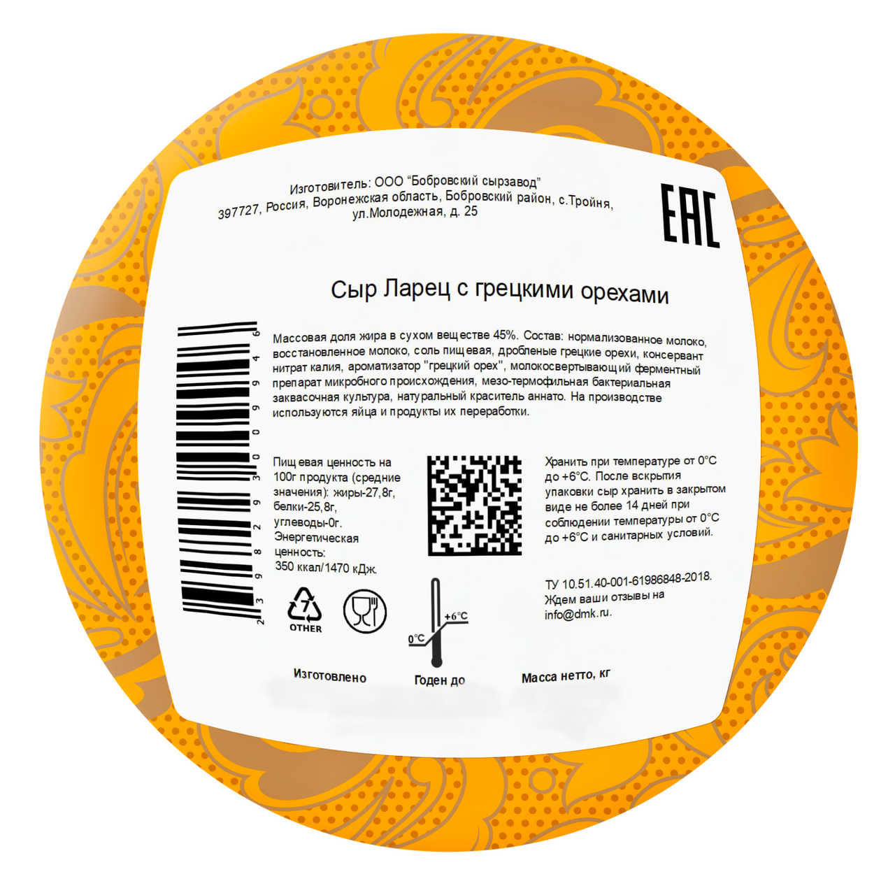 Сыр Ларец с грецкими орехами 45%, ~1кг – это будоражащее сочетание сыра и, уникального по своей природе, грецкого ореха. Консистенция сыра, нежная и пластичная, рисунок на разрезе ажурный, состоит из угловатых глазков с россыпью дробленого грецкого ореха. Терпкость и аромат грецких орехов отлично оттеняют нежный, сливочный вкус сыра, а также питательность орехов придаст хорошее настроение на целый день.