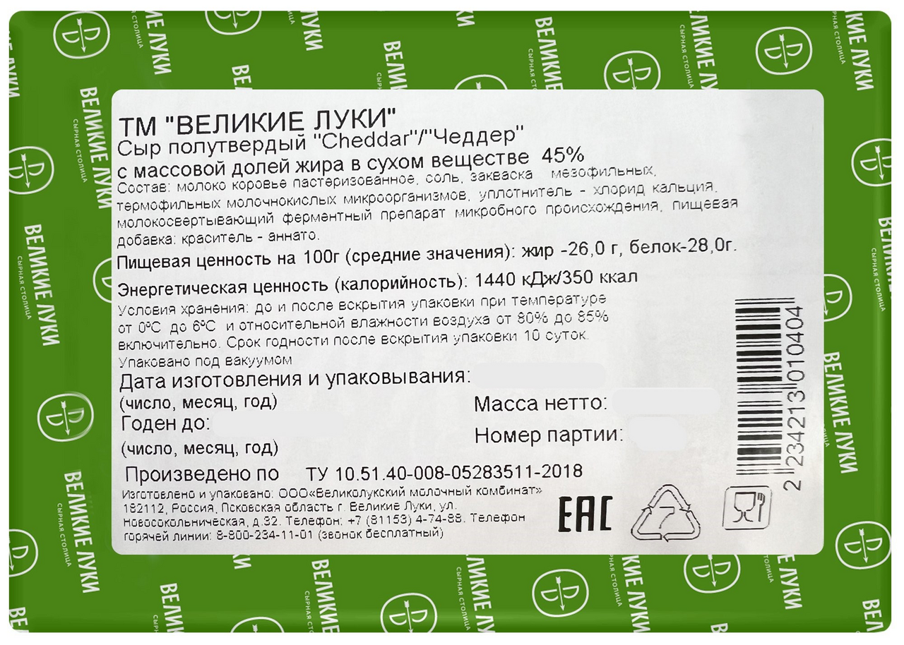Сыр чеддер Великие Луки 45%, ~1кг - полутвёрдый сыр аппетитного жёлтого цвета с ярким вкусом, в котором прослеживается приятная острота. У продукта однородная, в меру пластичная консистенция, благодаря которой его можно аккуратно нарезать. Сыр средней выдержки с кремовой гладкой текстурой без глазков насыщенного оранжево-красного цвета. Его отличает яркий сливочный вкус с присущей сорту Чеддер кислинкой, богатый аромат и пикантное послевкусие.