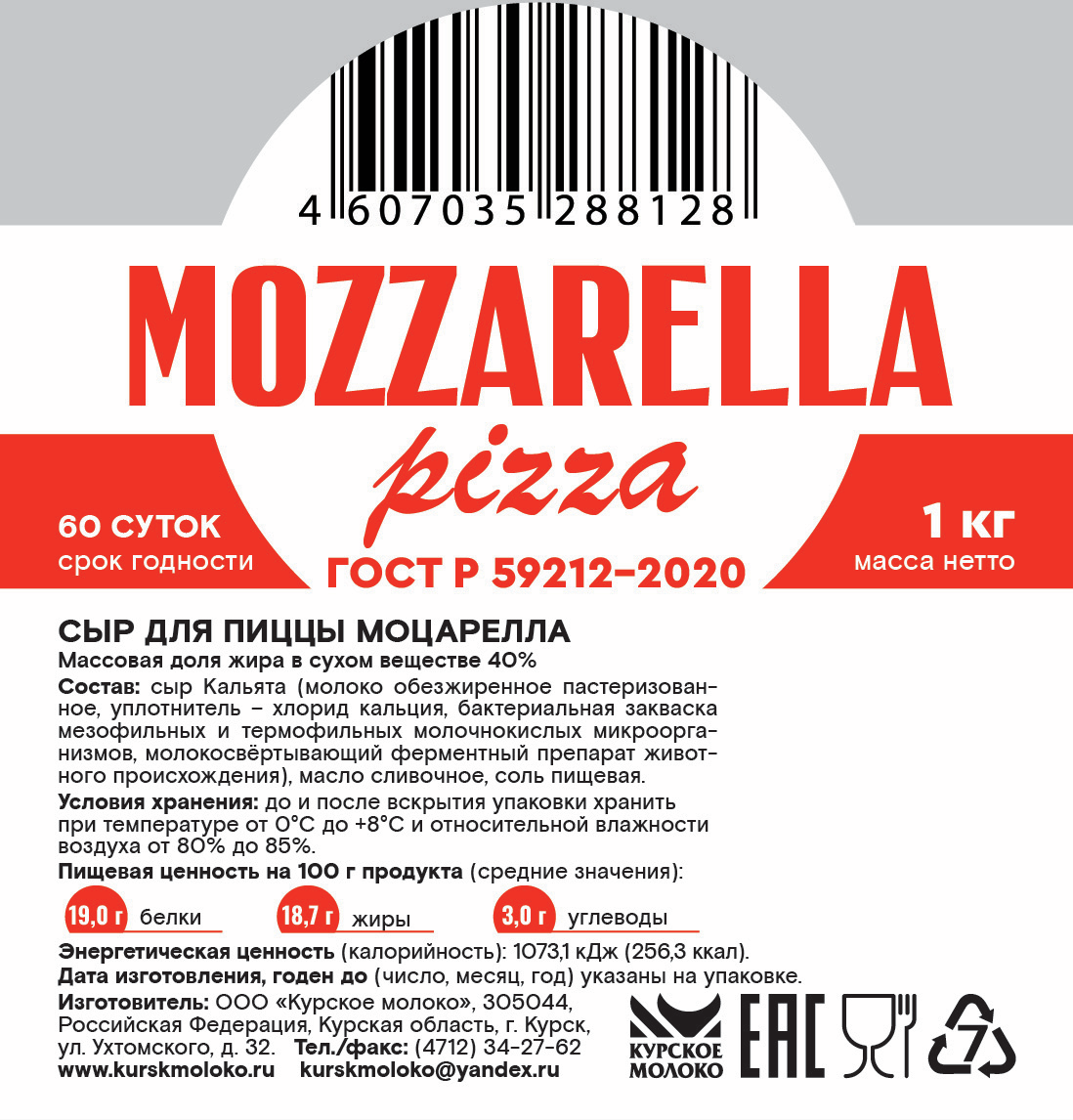 Сыр Курское молоко моцарелла для пиццы ГОСТ 40%, 1кг