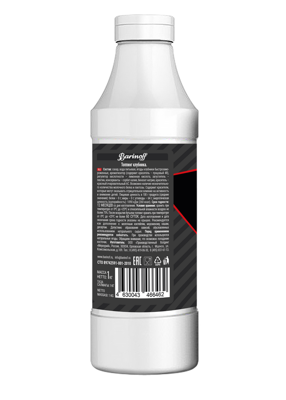 Топпинг Баринофф клубника, 1кг — полностью готовый к употреблению продукт. Это густой сладкий топпинг алого цвета с ароматом спелой садовой клубники. Он отличается приятным ароматом и мягким, нежным вкусом с тонкими нюансами. Он подходит для горячих и холодных блюд. Благодаря своей плотной консистенции, топпинг подходит для украшения сложных кондитерских изделий. Он гармонично дополнит и разнообразит вкус мороженого, то��тов, пирожных, фруктовых салатов. Продукт имеет приятную консистенцию.