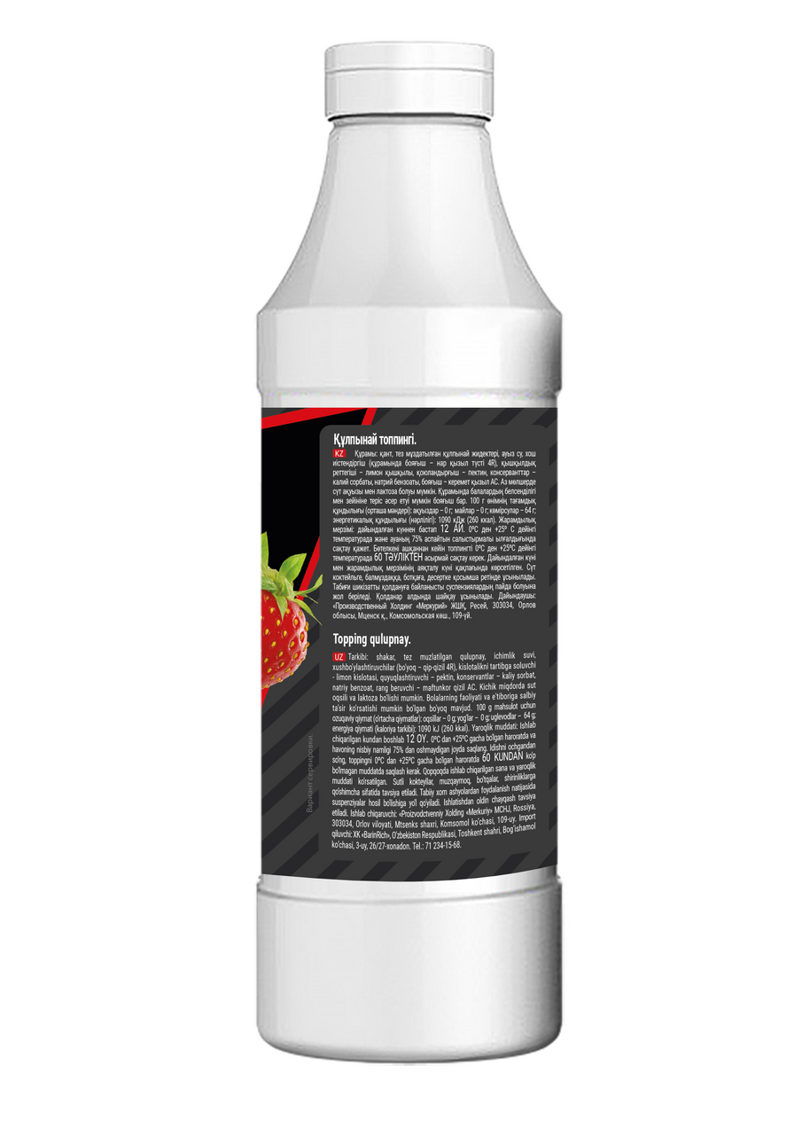 Сахар, вода питьевая, ягода клубники быстрозамороженная, регулятор кислотности – лимонная кислота, загуститель – пектин, ароматизатор, консерванты – сорбат калия, бензоат натрия, экстракт клубники, краситель – пунцовый 4R.