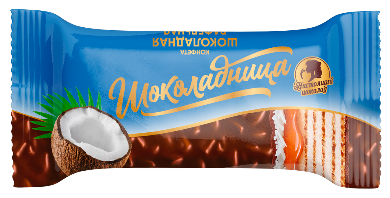 Конфеты вафельные шоколадные с кокосом и карамелью от бренда Шоколадница – десерты с вафлями, покрытые шоколадной глазурью. Содержание шоколада в конфете не менее 27%. Продукт изготавливается исключительно из натуральных компонентов, 34% содержание цельного сгущенного молока.