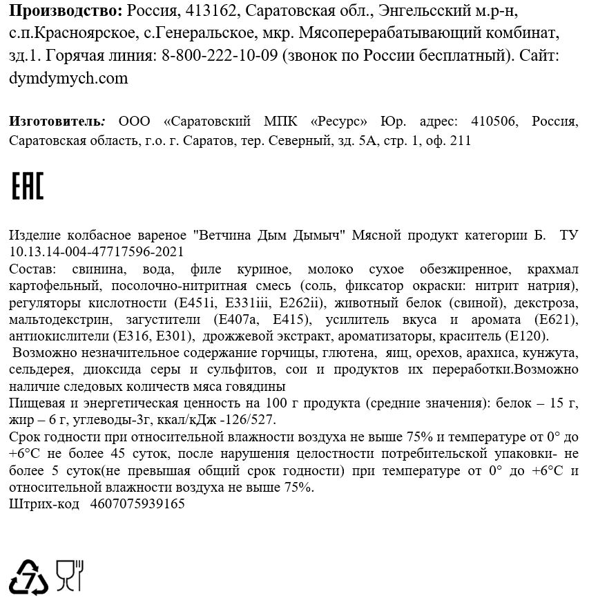 Опираясь на лучшие традиции, был создан собственный рецепт Ветчины Дым Дымыч. Сочная свинина, кусочки нежного куриного филе и минимум специй, который не перебивает насыщенный вкус и аромат мяса. Она станет отличным дополнением к семейному завтраку, обеду или ужину. Отлично сочетается с любым гарниром. Можно использовать при приготовлении салатов, супов, горячих блюд.