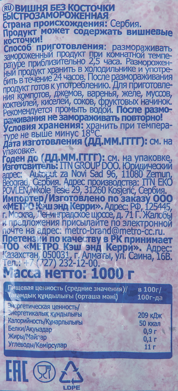 aro Вишня без косточки 1кг – это замороженный продукт без ГМО и добавок. В состав входят большое количество витаминов и минералов, полезных для организма человека. Продукт можно применять для приготовления разных кондитерских изделий и оригинальных десертов, а также использовать в качестве начинки для выпечки. Такой порции ягод вполне хватит для пирога из дрожжевого или слоёного теста, компота или киселя. Вишня станет хорошим вариантом для украшения различных коктейлей, муссов и смузи. Она хорошо сочетается орехами, шоколадом, фруктами. Выпускается в плотной упаковке с привлекательным дизайном. aro – это известная торговая марка, которая принадлежит торговой сети Метро. Продукция, выпускаемая под этим брендом, имеет низкие цены, благодаря чему она доступна даже людям с низкими доходами. Широкий ассортимент включает в себя: разовую посуду, гигиенические принадлежности, пакеты для мусора, бутыли, ведра и многое другое.