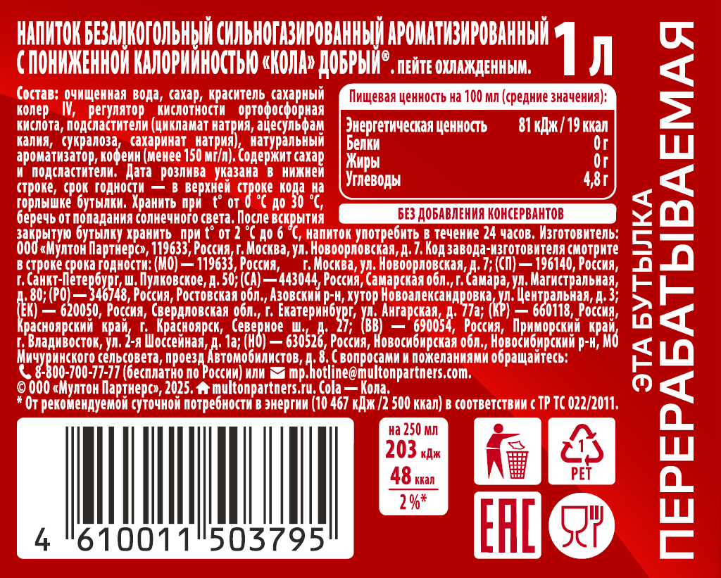 Напиток Добрый Кола газированный, 1л - это яркий и освежающий заряд хорошего настроения, которым так хочется делиться с тем, кто рядом. Рекомендуется пить охлажденным. Это классический сильногазированный напиток с насыщенным вкусом и знакомым ароматом. Во вкусовом профиле ощущаются пряно-цитрусовые ноты, которые создают сбалансированную кисло-сладкую композицию с мягким освежающим послевкусием. Напиток отличается высокой степенью газирования, благодаря чему дарит яркое ощущение свежести и бодрит с первых глотков. Вкус максимально приближен к традиционной коле и узнаётся с первых нот. Добавление кофеина придаёт напитку тонизирующий эффект, что делает его особенно ценным в ситуациях, когда необходим дополнительный заряд энергии. Удобная пластиковая бутылочка подойдёт для подачи на стол и легко поместится в дорожную сумку. Напиток рекомендуется подавать охлаждённым.
