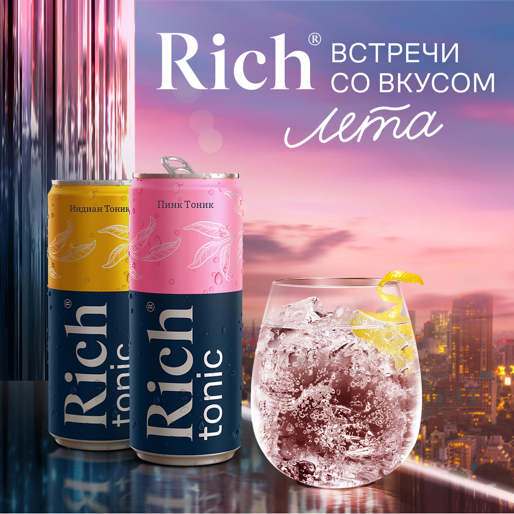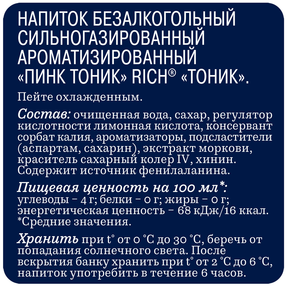 Напиток газированный Rich Pink Тоник, 1л x 12 шт - это сильногазированные напитки высокого качества с особенным вкусом для настоящих ценителей. Это так же изысканный горьковатый вкус тоника, оттененный нотами ягод и гибискуса. Отлично подойдет в качестве ингредиента для коктейлей.